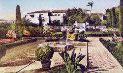 Lotusland, home and exotic gardens of European opera diva Mme. Ganna Walska, is depicted in a 1920s tinted photograph.